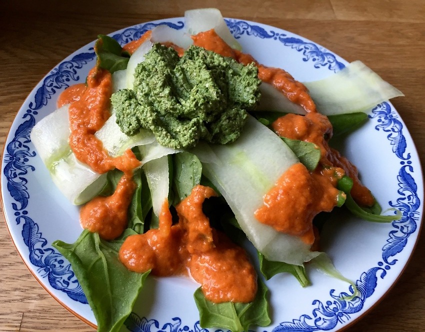 Nu de utlovade recepten på raw tomatsås och någon slags pestokräm. Båda passar att serveras till hyvlad gurka och gröna blad.