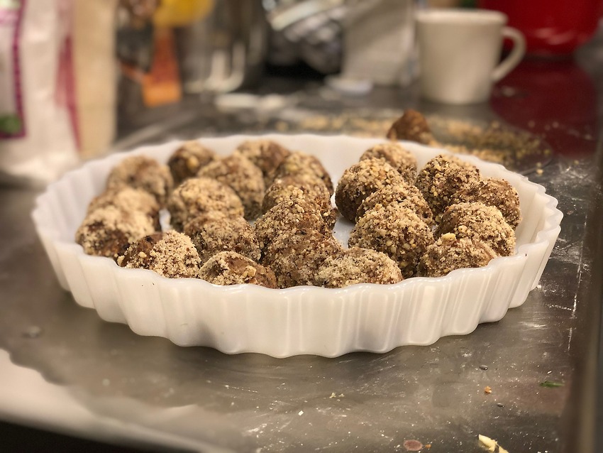- Rulla massan till jämna små bollar och rulla dem i riven kokos eller finhackad mandel eller hasselnöt.
