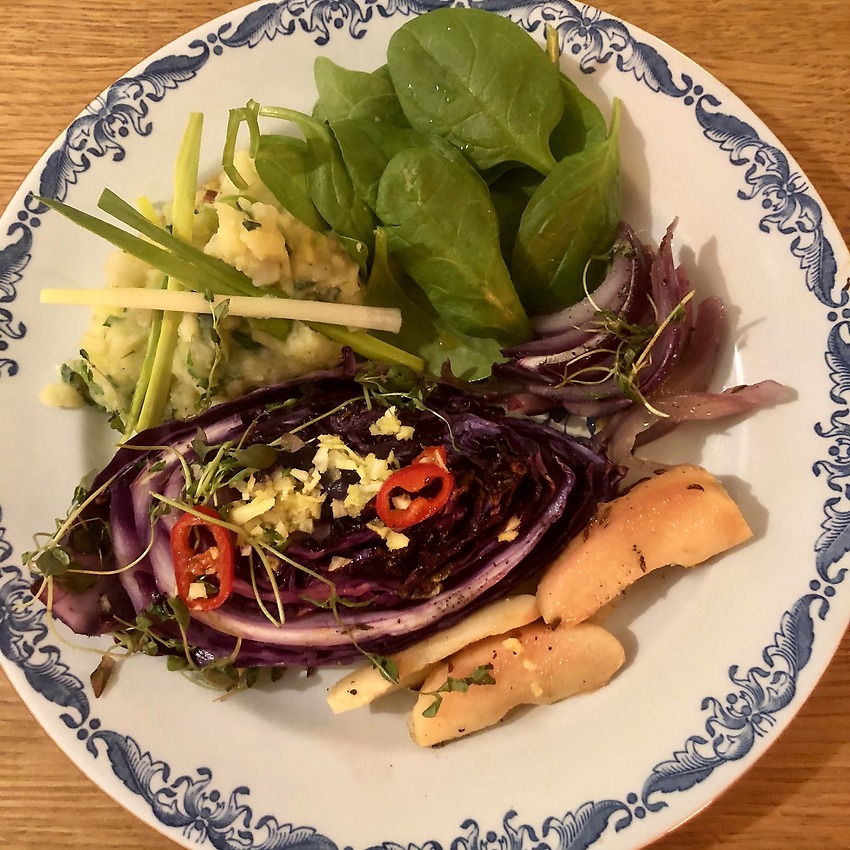 Till detta serverade jag stomp på potatis och jordärtskocka med spenat och purjofräs och färsk babyspenat.