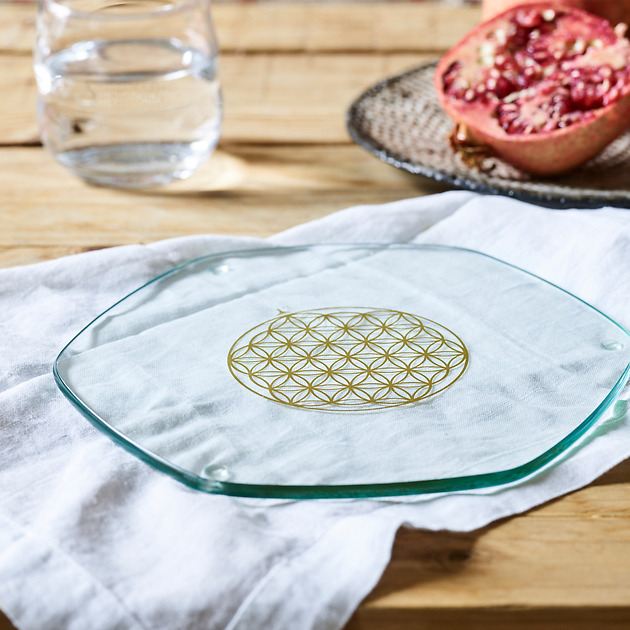 Energiplattan är ett handpolerat underlägg i glas med en inbränd Livets Blomma, i Guld, i botten. Avsikten med detta underlägg är att förstärka energin och vitalisera det som placeras på plattan. Plattorna i glas är inte gjorda för hög värme och kan inte användas som underlägg för heta kärl.